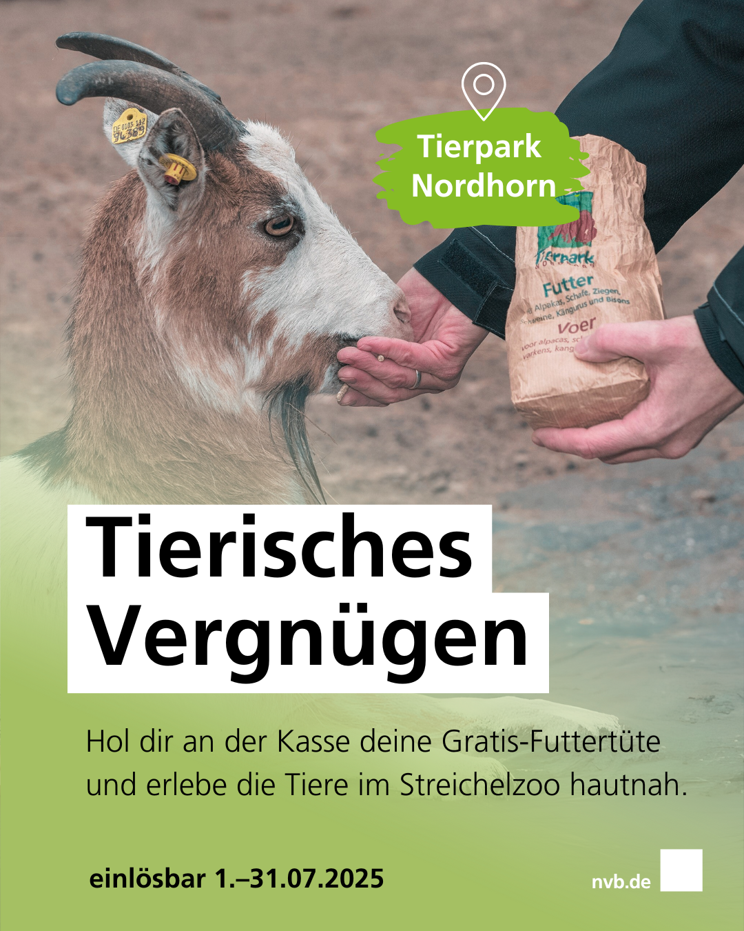 🐐🤍 Neugierig und immer hungrig: Die Ziegen und Schafe im Streichelzoo im @tierparknordhorn freuen sich jederzeit über Besuch – und natürlich auf ein paar leckere Happen.😋 Mit dem #Gutschein aus dem nvb-Jahreskalender bekommt ihr im Juli ein Tütchen Tierfutter gratis an der Kasse. Einfach ausschneiden, mitbringen und losfüttern. Ein tierisch schönes Erlebnis für Groß und Klein. 🥕🐑 Wir wünschen euch einen tollen Sommer und viel Freude beim Tierparkbesuch!🐾