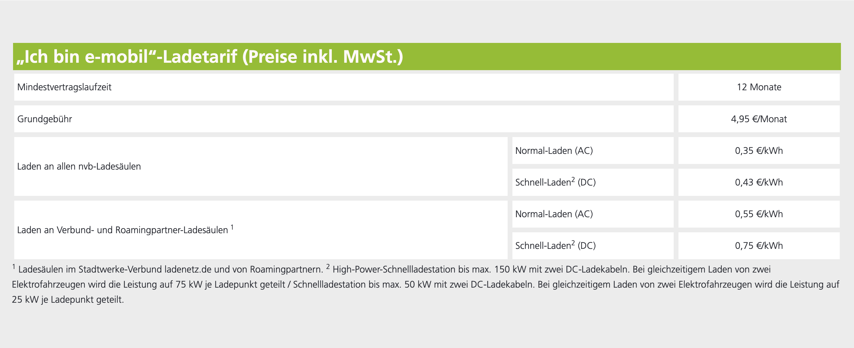 1Ladesäulen im Stadtwerke-Verbund ladenetz.de und von Roamingpartnern. 2High-Power-Schnellladestation bis max. 150 kW mit zwei DC-Ladekabeln. Bei gleichzeitigem Laden von zwei Elektrofahrzeugen wird die Leistung auf 75 kW je Ladepunkt geteilt / Schnellladestation bis max. 50 kW mit zwei DC-Ladekabeln. Bei gleichzeitigem Laden von zwei Elektrofahrzeugen wird die Leistung auf 25 kW je Ladepunkt geteilt.