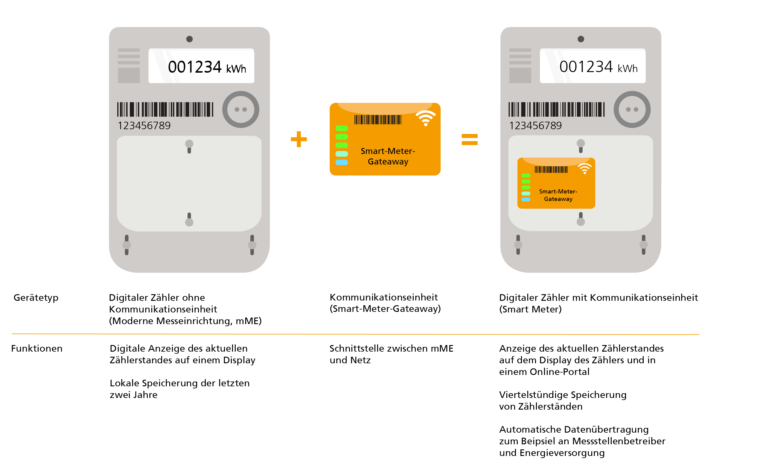 Der Unterschied zwischen einer modernen Messeinrichtung (mMe) und einem intelligenten Messsystem ist leicht zu erkennen. Die moderne Messeinrichtung besitzt ein LCD-Display auf dem die Zählerstände angezeigt werden. Wenn Sie ein intelligentes Messsystem besitzen, dann befindet sich an Ihrem Stromzähler zusätzlich noch eine Kommunikationseinheit (Smart-Meter- Gateway). Beide Komponenten sind in einem Gerät vereint.